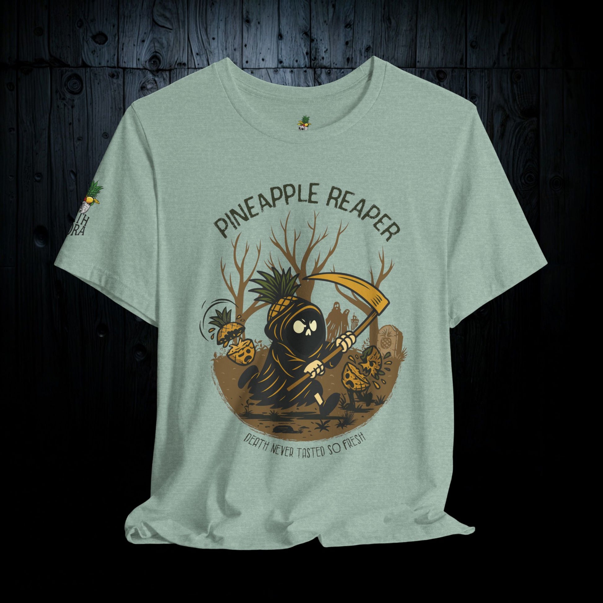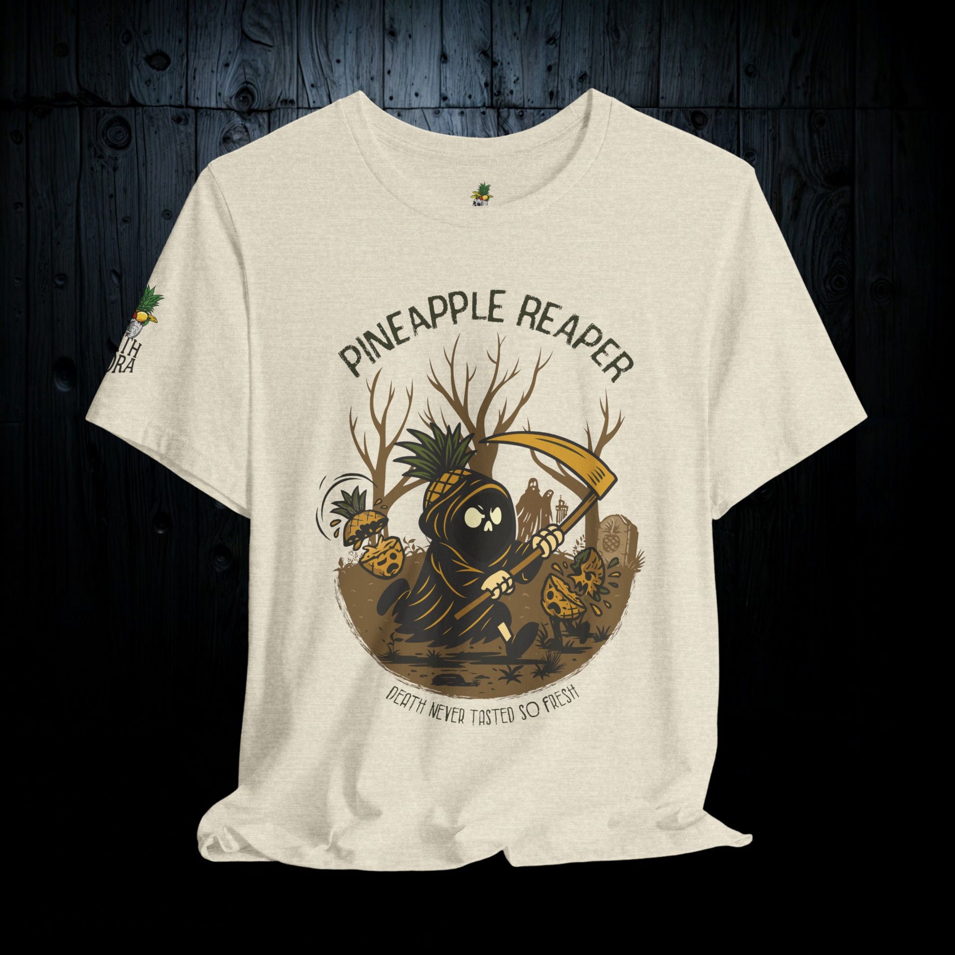 Summon the jungle spirit with the Pineapple Reaper tee—a tribute to the spectral harvester who wanders the overgrown groves. Soft, lightweight, and hauntingly comfortable, this unisex jersey fits like it’s already lived a few lives. The classic retail cut and crew neckline make it an easy layer, whether you’re lurking in the shadows or just… existing among the living.
